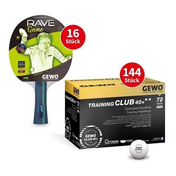 Zestaw składa się 144 piłeczek Piłki Club 40+** 144 szt.i 16 rakietek Gewo Rave Game. Idealne dla początkujących i świetnie dopasowane do warunków szkolnych.