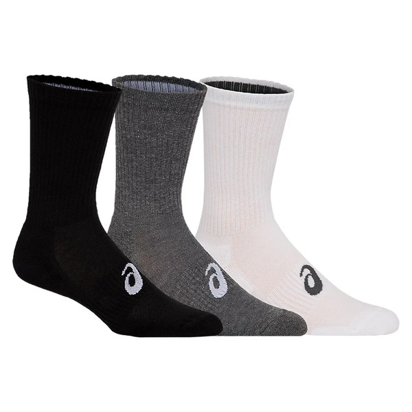 Asics Sock Crew 3 pary w kolorze czarnym, białym i szarym.