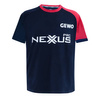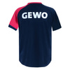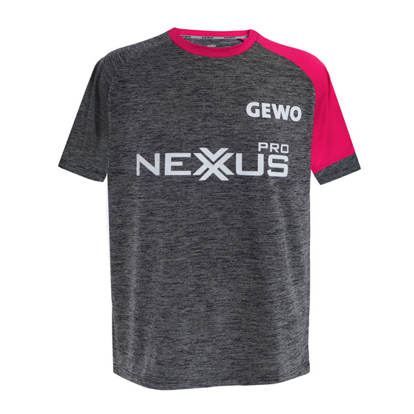 Sportowa koszulka z elastycznego włókna funkcyjnego i okrągłym dekoltem. Kołnierz i jeden rękaw są kontrastujące kolorystycznie. Z białym nadrukiem z przodu GEWO i NEXXUS Pro oraz nadrukiem z tyłu GEWO.