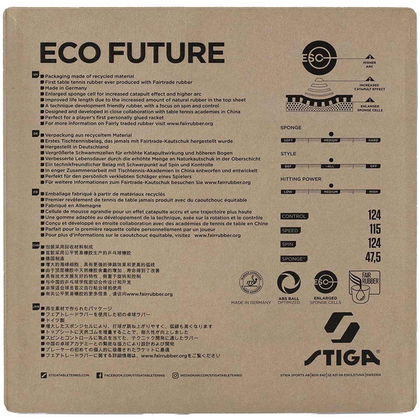 Przyszłość jest zielona – wybierając ECO Future, od samego początku podejmujesz decyzję przyjazną dla środowiska. Opakowanie jest wykonane z materiałów pochodzących z recyklingu, co odzwierciedla zaangażowanie STIGA w redukcję odpadów i zmniejszenie śladu węglowego. Ale nasze zaangażowanie w zrównoważony rozwój nie kończy się na opakowaniu; z dumą ogłaszamy, że ECO Future jest pierwszą na świecie okładziną do tenisa stołowego wykonaną z gumy Fairtrade. To przełom pod każdym względem, nie tylko w zakresie optymalizacji wyników, ale także promowania etycznych praktyk handlowych.